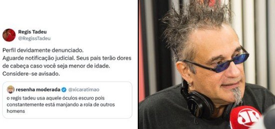 O comentarista Regis Tadeu, da Jovem Pan, anunciou que entrará com processo judicial contra um seguidor que fez acusações de caráter sexual contra ele nas redes sociais. O usuário teria afirmado que o comunicador usa óculos escuros para observar partes íntimas de outros homens.