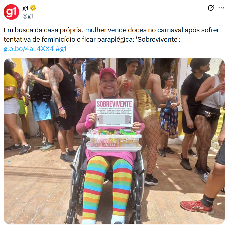 Na matéria, Creuza conta que perdeu o movimento das pernas após sofrer violência do ex-companheiro anos atrás e que, desde então, tenta se reerguer com fé e com o apoio do filho. Segundo o relato, ela começou a aproveitar o período de Carnaval como uma chance de aumentar a renda — atendendo foliões com pirulitos e outros itens — para sair do aluguel e melhorar de vida.