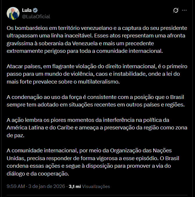 Segundo Lula, o uso da força em violação ao direito internacional abre caminho para um cenário de violência, instabilidade e enfraquecimento do multilateralismo. O presidente brasileiro declarou que a posição do Brasil é coerente com posturas adotadas anteriormente em crises internacionais, defendendo a condenação de ações militares unilaterais entre Estados.