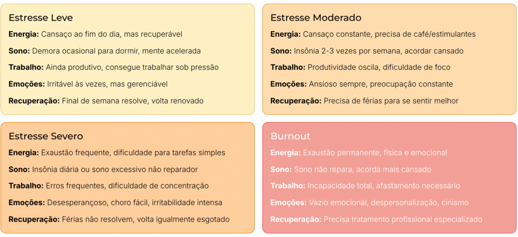 Exemplo prático: João dorme 9 horas e acorda mais cansado que quando deitou. Teve 4 gripes em 3 meses. Vive com dor de cabeça. O corpo dele está em burnout, não é mais “só estresse”.