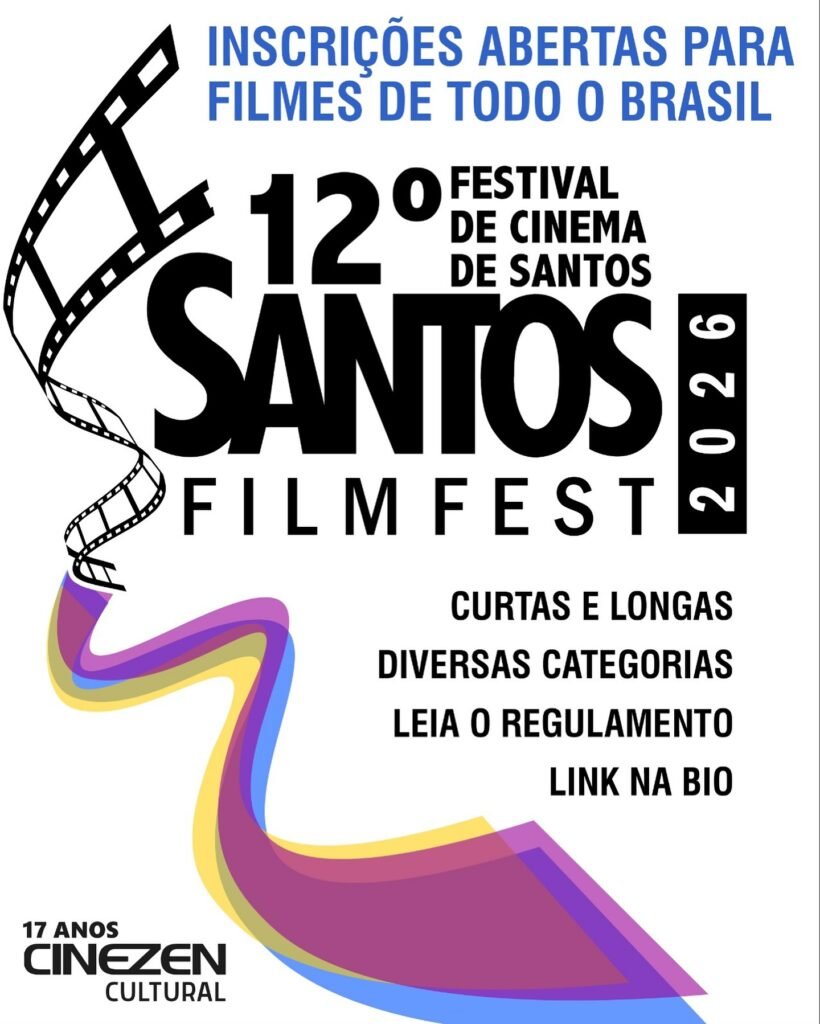 O Santos Film Fest abriu as inscrições gratuitas para a 12ª edição e recebe filmes de todo o Brasil até 20 de abril, por meio de formulário disponível no regulamento oficial do festival. Tradicionalmente realizado em junho, o evento de cinema será excepcionalmente transferido para agosto de 2026 em função da Copa do Mundo. As produções selecionadas serão exibidas em sessões na cidade de Santos, no litoral de São Paulo, em data e horário ainda a serem definidos.​